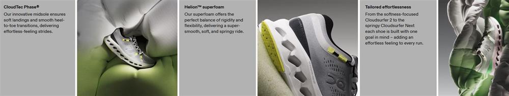 Priljubljeni model, ki se je razvil naprej. Cloudsurfer 2 vključuje izboljšano oblazinjenje CloudTec Phase® za še bolj gladek tek, poleg tega pa nov zgornji del iz mrežastega materiala za večjo zračnost. Nova računalniško optimizirana zasnova podplata in tekalne plasti povečuje vzdržljivost.